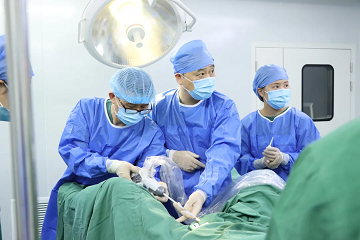 2023年10月,薛波新教授(左二)与胡华东主任(左一)联合实施瑞梦手术