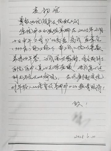 “我去你们医院感觉就不一样,胡主任又细致又专业,护士也非常有耐心,帮助我选择检查、社保途径、协调房间、食堂就餐……都想办法解决,真的,要给你们医院点赞,特别好,特别好!”