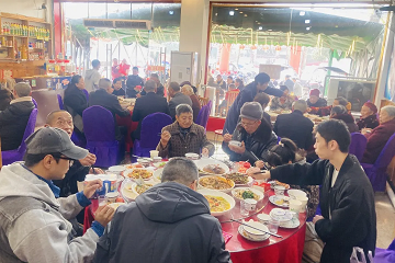 室外有冬日暖阳,宴席上是亲朋围坐,相伴闲谈、言笑晏晏,又有美食不断上座,格外温暖亲切。