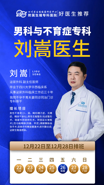 如果你正被男性不育、生殖整形、性功能障碍或泌尿外科疾病困扰,不妨走进四川省生殖专科医院刘嵩医生的诊室,让这位资深医者,用专业与温度为你的健康保驾护航。