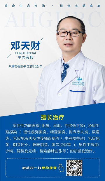 四川省生殖专科医院邓天财医生怎么样?邓天财医生专业擅长:男性性功能障碍(阳痿、早泄、阴茎异常勃起、性腺功能减退症、性欲低下、逆行射精,不射精症等);泌尿生殖感染(慢性前列腺炎、精囊腺炎、附睾睾丸炎、淋病及非淋性尿道炎、包皮龟头炎及性传播疾病生殖器疱疹、尖锐湿疣、传染性软疣、梅毒,生殖器念珠菌及阴虱病等);前列腺增生的诊断及治疗;生殖器整形(包皮包茎环切术、阴茎短小阴茎延长术、阴茎增粗术、隐匿阴茎延长术、包皮系带过短矫正术,阴茎弯曲矫正术,阴茎海绵体硬节症等)的诊断及治疗;男性不育症(少精、弱精、畸形精子及无精症、精索静脉曲张、克氏征、卡尔曼综合征、辅助生殖前检查等)。