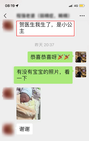 近日,一对饱受不孕困扰的夫妇,在四川省生殖健康研究中心附属生殖专科医院(简称“四川省生殖专科医院”)贺必新医生的精准诊疗与悉心指导下,成功摆脱困境,迎来了一名健康可爱的宝宝。患者通过微信向贺医生发来感谢。