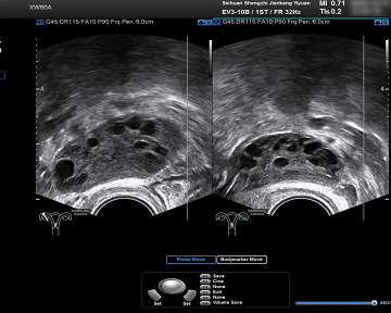 2、妇科超声检查:核心检查之一(建议在月经第3-5天进行,月经不规律可随时进行)。一侧或两侧卵巢直径2-9mm卵泡≥12个,或卵巢体积≥10cm³,即多囊卵巢样改变。