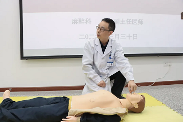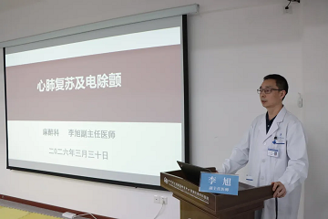 麻醉科李旭副主任医师以《心肺复苏及电除颤》为题,系统阐述了心肺复苏的“黄金4分钟”原则及其在抢救心脏猝死中的关键作用。他详细讲解了心脏骤停的识别、高质量胸外按压的五大标准(位置、深度、频率、回弹、中断时间)、开放气道与人工呼吸的规范操作,以及电除颤的适应证、电极板放置位置和能量选择等核心知识。